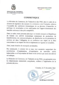 Guinée: « Toute situation de monopole est interdite en Guinée dans le secteur économique » (communiqué du ministre du commerce)