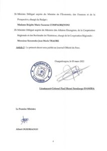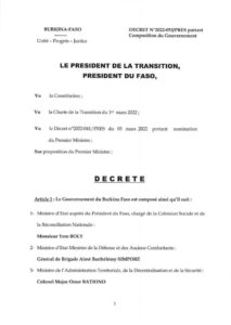 Le président du Faso, le lieutenant-colonel, Paul-Henri Sandaogo Damiba, a pris ce samedi 05 mars 2022 un décret portant composition du gouvernement de la Transition