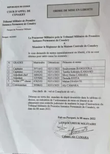 Selon le contenu de l’ordre de mise en liberté, le procureur militaire près le tribunal militaire de première instance permanent de Conakry instruit le régisseur de la maison centrale de mettre immédiatement en liberté les six militaires détenus pour des faits de vol et complicité de vol.