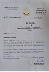 Dans un courrier consulté par Libreopinionguinee, le ministre de l’administration du territoire et de la décentralisation, Mory Conde demande au président de l’ANAD, Cellou Dalein Diallo de fournir dans un bref délai, les agréments, conventions, des partis politiques membres de sa coalition afin de s’assurer que la coalition et les partis existent légalement.
