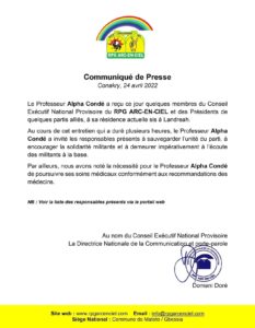 COMMUNIQUÉ DE PRESSE DU RPG RELATIF A LA RENCONTRE AVEC LE PROFESSEUR ALPHA CONDÉ CE DIMANCHE 24 AVRIL 2022 A LA UNEPOLITIQUE By LIBREOPINIONGUINEE.COM On Avr 24, 2022 0 COMMUNIQUÉ DE PRESSE DU RPG RELATIF A LA RENCONTRE AVEC LE PROFESSEUR ALPHA CONDÉ CE DIMANCHE 24 AVRIL 2022