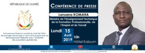 Conakry le 14 Avril 2019 – A la faveur de la conférence de presse hebdomadaire des membres du Gouvernement, le Ministre de l’enseignement technique, de la formation professionnelle, de l’emploi et du travail sera face à la presse le lundi 15 Avril 2019 à 10h à l’hôtel Primus Kaloum. À cette occasion, Lansana Komara fera l’état des lieux de son département et présentera les programmes, les acquis et les défis à relever.