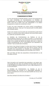 Communiqué du ministre de l’administration du territoire et de la décentralisation (MORY CONDE) A LA UNEPOLITIQUE By LIBREOPINIONGUINEE.COM On Avr 19, 2022 0 Communiqué du ministre de l’administration du territoire et de la décentralisation (MORY CONDE)