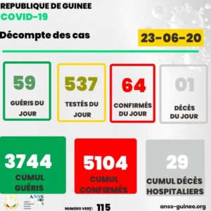 Trouvez en infographie les données du 22 juin et la mise à jour des cumuls(guéris, confirmés et décès) du COVID-19 en Guinée à la date du 23-06-2020. Tous engagés pour la stratégie