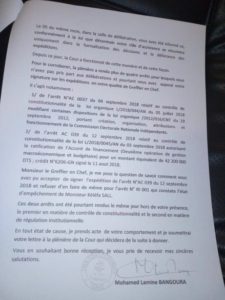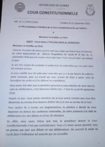 CRISE A LA COUR CONSTITUTIONNELLE DE GUINEE, Le greffier en chef s’est désolidarisé de la démarche des conseillers de la Cour constitutionnelle qui ont destitué leur président, Kèlèfa Sall. Il l’a fait savoir à travers un courrier qu’il a adressé au vice-président de la Cour qui a réagi. Lire la lettre ci-dessous