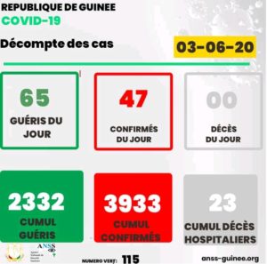 Conakry, l’agence nationale de sécurité sanitaire (ANSS), dans son rapport publié ce mercredi 3 juin, a annoncé que 47 personnes ont été déclarées positives au Covid-19.