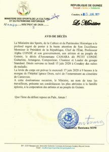 Décès du guitariste Ansoumane Camara « Petit Condé » communiqué du ministère des sports de la culture et du patrimoine historique