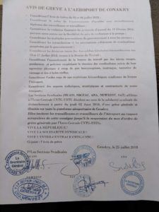 Grève en Guinée : L’aéroport de Conakry menace aussi de fermer (copie avis de grève)