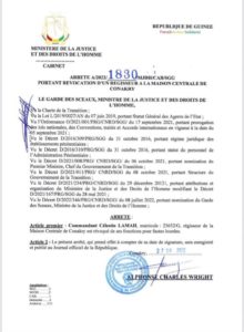 GUINÉE: Arrêté portant révocation d’un Regisseur à la maison centrale de Conakry A LA UNESOCIÉTÉ By LIBREOPINIONGUINEE.COM Last updated Juil 28, 2022 0
