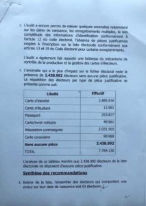 Le rapport confirme les mêmes conclusions de l’OIF. A savoir que : 2.438.992 életeurs de la liste électorale ne disposent d’aucune pièce justificative.