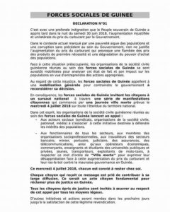Après des heures de concertation en synergie sur une table ronde, les différents membres de la société Civile présents ont dans une déclaration rendue publique invité les citoyens à une mobilisation générale pour contraindre le gouvernement à reconsidérer sa décision. ‹‹les forces sociales de Guinée invitent les citoyens à un sursaut national à travers une série de manifestations citoyennes qui commence par une journée ville morte prévue le mercredi 04 juillet 2018 sur toute l’étendue du territoire national›› annonce Sékou Koundouno Président du Balais citoyen. Tous les citoyens sans exception sont concernés par rapport à cet appel ‹‹nous lançons un appel aux acteurs sociaux (syndicats, organisations de la société civile, patronat, média) à s’associer à cette initiative destinée à défendre les intérêts des populations›› lance-t-il. Dans cette déclaration il est prié aux fonctionnaires de tous les secteurs, aux membres des organisations socioprofessionnelles, aux travailleurs des secteurs bancaires, miniers, portuaires, judiciaires, des assurances, des télécommunications, ainsi qu’aux opérateurs économiques, commerçants, enseignants et étudiants des universités publiques et privées, jeunes, transporteurs, exploitants de mototaxis, à respecter ce mot d’ordre de »ville morte » , pour exprimer leur désapprobation face à cette augmentation du prix du carburant et leur ras-le-bol contre la mauvaise gouvernance en Guinée. De l’autre côté, ce sont les syndicats qui laissent un délai de 72h au gouvernement pour revenir sur sa décision, sinon ils déclencheront une grève générale. Libreopinionguinee.com vous propose de lire la déclaration ci-dessous