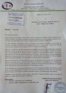 CONAKRY, Nous l’avons appris dans l’après-midi de ce vendredi 03/08/2018. Le député Dr Ousmane Kaba est visé par une plainte du « Balai citoyen ». Selon le contenu de la correspondance, adressé jeudi, 02 août 2018 au procureur général, la structure de la société civile reproche au président du Parti PADES des propos “ethnocentristes”, ténus le 31 juillet dernier sur les ondes d’une radio privée basée en haute Guinée.