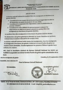 GUINEE, le Syndicat libre des enseignants et chercheurs de Guinée (SLECG) a annoncé mardi une grève le 3 octobre prochain, invitant les enseignants à rester à la maison et les parents à garder leurs enfants.
