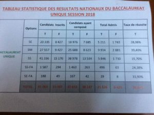 Le Ministère de l’Éducation Nationale et de l’Alphabétisation informe les bacheliers, les parents et amis des bacheliers que, le résultats du baccalauréat unique session 2018 seront disponibles ce lundi 16 juillet sur toute l’étendue du territoire national à partir de 17 h. Voici ci-dessus le tableau statistique des résultats nationaux du baccalauréat unique session 2018