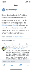 Dans un tweet, la Présidence du Mali écrit que “le président Ibrahim Boubacar Keita salue un artiste accompli et un symbole de l’intégration entre les peuples de Guinée et du Mali »