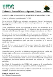 L’UFDG de Cellou invite ses militants à cesser des commentaires haineux sur les morts du coronavirus et appelle au respect des mesures barrières (Communiqué) A LA UNEPOLITIQUE By LIBREOPINIONGUINEE.COM On Avr 19, 2020 0 Lire le communiqué ci-dessous