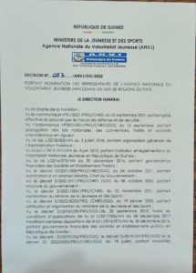 Ministère de la jeunesse et des Sports : Le DG de l’ANVJ, Macka Baldé nomme les huits (8) Représentants régionaux de l’agence nationale du volontariat jeunesse (copie décision)