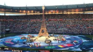 Avant le coup d’envoi, presque au soleil couchant, le public de Saint-Denis a eu droit à une cérémonie d’ouverture au son des flonflons, et notamment de chansons nostalgiques, dans un décor champêtre où trônait au milieu de la pelouse une Tour Eiffel géante surmontée du Trophée Webb Ellis, la récompense décernée à l’équipe vainqueur de la Coupe du monde de rugby à XV. Deux cent ans après la création de ce sport, la dixième Coupe du monde de rugby est devenue un événement majeur.