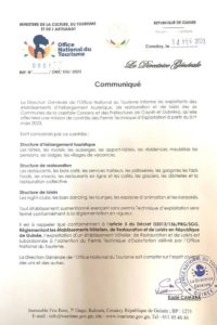 Après le communiqué adressé à ces structures, l’Office National du Tourisme (ONT) enverra à partir du 1er mars prochain, une mission de contrôle des permis techniques d’exploitation auprès des exploitants des établissements d’hébergement touristique, de restauration et de loisirs des six communes de Conakry et des préfectures de Coyah et de Dubréka.