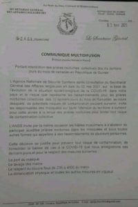 Dans un communiqué dont copie a été transmise à Libreopinionguinee ce lundi 3 mai 2021, le ministre secrétaire général aux affaires religieuses El Hadj Aly Jamal Bangoura, a décidé de l’interdiction des prières nocturnes collectives.
