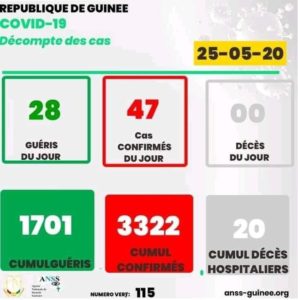 Situation du Covid-19 en Guinée : voici les chiffres officiels du jour A LA UNESANTÉ By LIBREOPINIONGUINEE.COM On Mai 26, 2020 0 Situation du Covid-19 en Guinée : voici les chiffres officiels du jour S