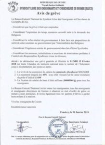 Guinée-Le Syndicat Libre des Enseignants et Chercheurs de Guinée (SLECG) dirigé par Aboubacar Soumah vient de lancer un avis de grève à partir du lundi 12 février 2018 sur toute l’étendue du territoire national.