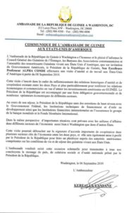 Visite du président Alpha Condé aux États-Unis : Communiqué de l’Ambassade de Guinée A LA UNEINTERNATIONALNEWS By LIBREOPINIONGUINEE.COM On Sep 8, 2019 0 Donald Trump et Alpha Condé Visite du président Alpha Condé aux États-Unis : Communiqué de l’Ambassade de Guinée